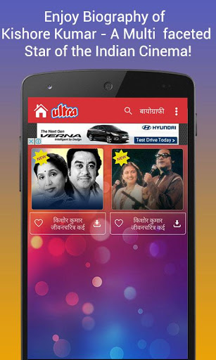 Brought to you by Ultra Media & Entertainment Pvt. Ltd., this app helps you listen & see to the best of Kishore Kumar Songs, at your fingertip. Moreover, you can enjoy this immense collection on 2G/3G and Wifi as well. So, download this app now.