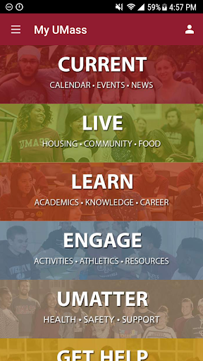 My UMass, formerly Living at UMass, provides the University of Massachusetts Amherst community mobile access to campus events, calendars and notifications. Important information and deadlines from a variety of programs and resources are available at your fingertips. Enjoy student experience videos and social media feeds for a virtual look into student life at UMass. Explore ways to connect with your community, engage with your peers, build relationships, succeed academically, and utilize the many resources available to you at UMass.
