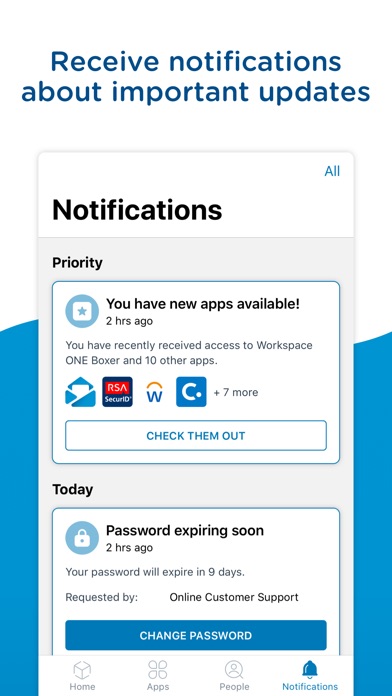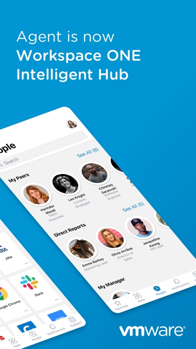 The Intelligent Hub app is the single destination where employees can have an enhanced user experience with unified onboarding, catalog, and access to services such as People, Notifications, and Home.