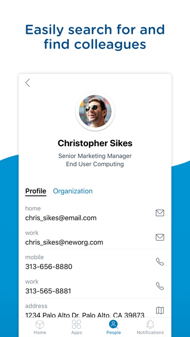 Easily search through your corporate directory by first name, last name, or email address and view employee details such as photos, titles, email addresses, phone numbers, office location and reporting structures. You can call, text, or email easily from within the app.