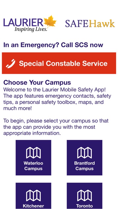 SAFEHawk is a mobile safety app developed for our students, staff, faculty and visitors at Wilfrid Laurier University. The app provides fast and easy access to campus security services, emergency guidelines and alerts, campus maps, personal support resources, safety tips, tools and more! This app was developed by Wilfrid Laurier University Special Constable Service.