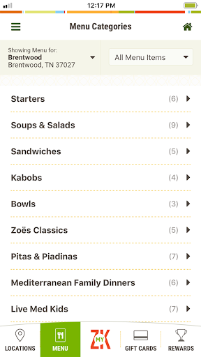 Fresh made Mediterranean at your fingertips! Our newly enhanced Zoës Kitchen mobile app allows you to easily browse our menu, find your Zoës location, order delicious Mediterranean goodness and more. Plus, our new mobile app makes earning and redeeming your ZK Rewards easier than ever!